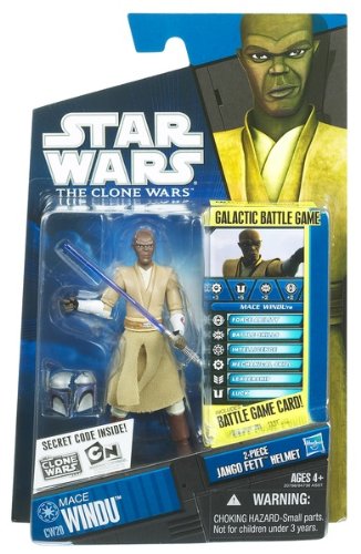 Measuring approximately 3 ¾â? tall, Clone Wars 2010 Series 02 Revision 01: Mace Windu features multiple points of articulation, and is accompanied by character-specific accessories, Galactic Battle Game card, battle base and game die. Mace Windu is equipped with his purple lightsaber, and is accompanied by the vertically shorn helmet of Jango Fett. An influential member of the Jedi High Council, believed by many to be second only to Yoda, Mace Windu was renowned for his swordsmanship. During the Battle of Geonosis, in which Windu and a handful of Jedi warriors persevered against seemingly insurmountable odds, Mace Windu engaged and succeeded in killing renowned bounty hunter Jango Fett.